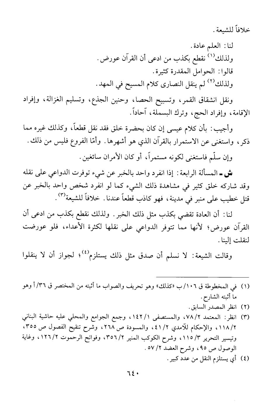 ش ــ المسألة الرابعة: إذا انفرد واحد بالخبر عن شيء توفرت الدواعي على نقله وقد شاركه خلق كثير في مشاهدة ذلك الشيء كما لو انفرد شخص واحد بالخبر عن قتل خطيب على منبر في مدينة، فهو كاذب قطعاً عندنا. خلافاً للشيعة.