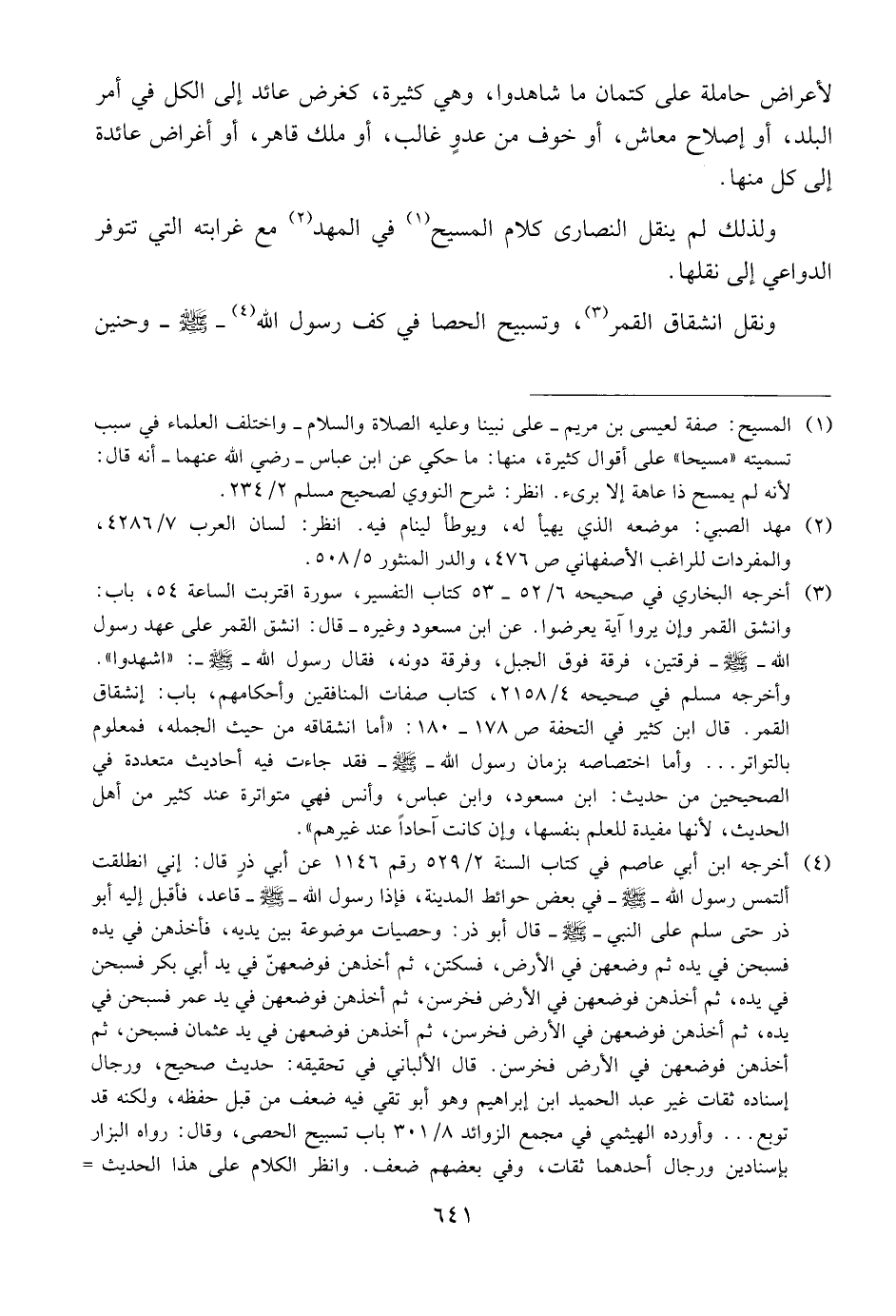 ونقل انشقاق القمر، وتسبيح الحصا في كف رسول الله ــ صلى الله عليه وسلم ــ وحنين