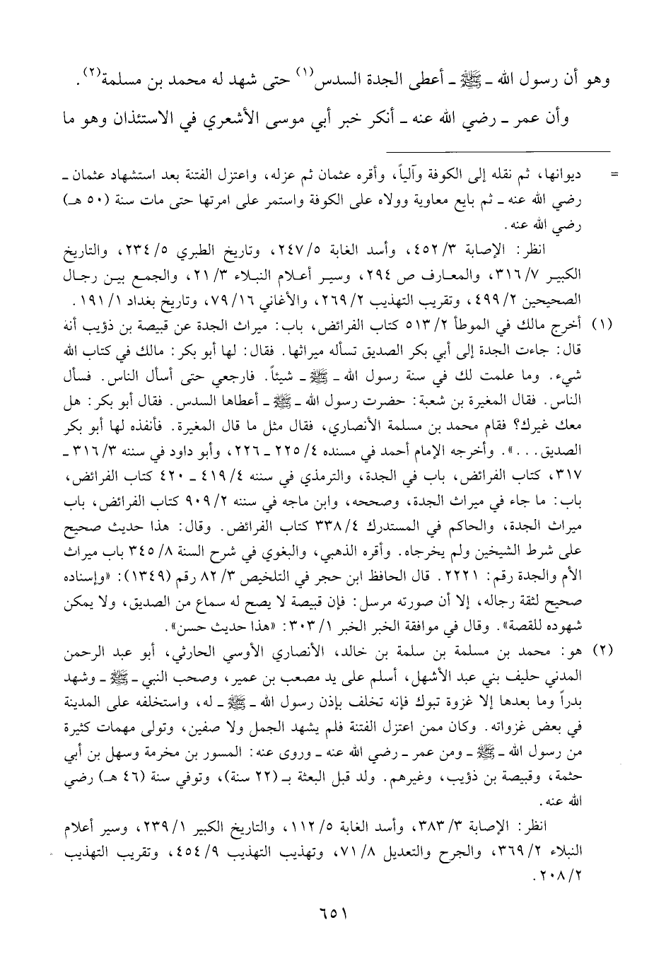 وهو أن رسول الله ــ صلى الله عليه وسلم ــ أعطى الجدة السدس حتى شهد له محمد بن مسلمة.