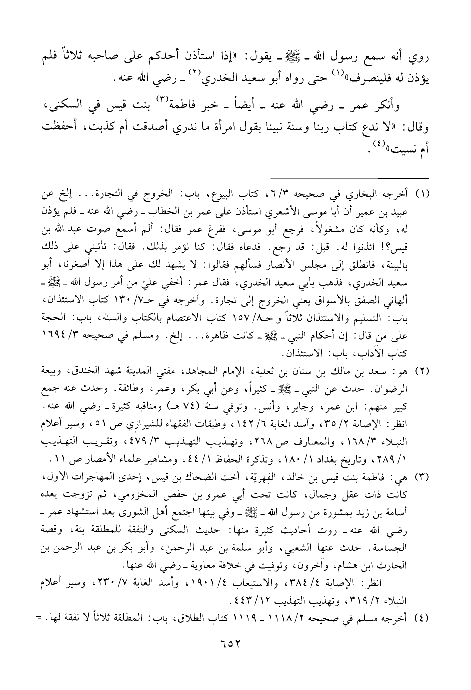 وأنكر عمر ــ رضي الله عنه ــ أيضاً ــ خبر فاطمة بنت قيس في السكنى، وقال: {{لا ندع كتاب ربنا وسنة نبينا بقول امرأة ما ندري أصدقت أم كذبت، أحفظت أم نسيت}}.