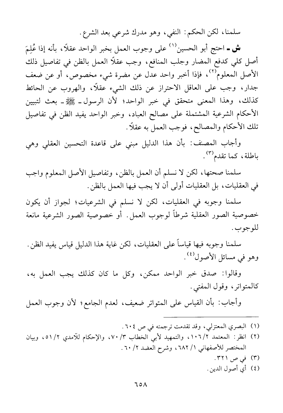 ش ــ احتج أبو الحسين على وجوب العمل بخبر الواحد عقلاً، بأنه إذا عُلِمَ أصل كلي كدفع المضار وجلب المنافع، وجب عقلاً العمل بالظن في تفاصيل ذلك الأصل المعلوم، فإذا أخبر واحد عدل عن مضرة شيء مخصوص، أو عن ضعف جدار، وجب على العاقل الاحتزاز عن ذلك الشيء عقلاً، والهروب عن الحائط كذلك، وهذا المعنى متحقق في خبر الواحد؛ لأن الرسول ــ صلى الله عليه وسلم ــ بعث لتبيين الأحكام الشرعية المشتملة على مصالح العباد، وخبر الواحد يفيد الظن في تفاصيل تلك الأحكام والمصالح، فوجب العمل به عقلاً.