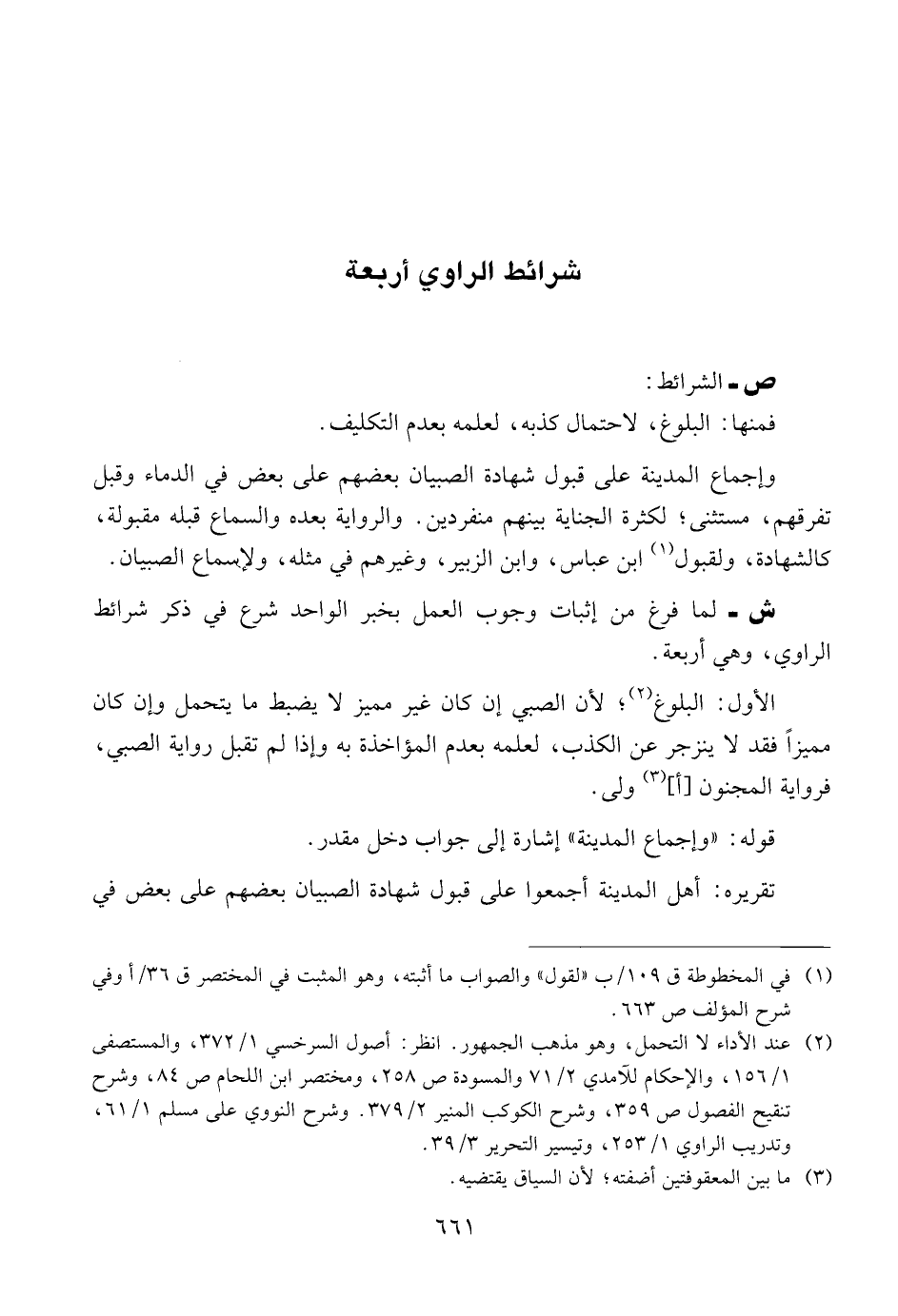 ش ــ لما فرغ من إثبات وجوب العمل بخبر الواحد شرع في ذكر شرائط الراوي، وهي أربعة.