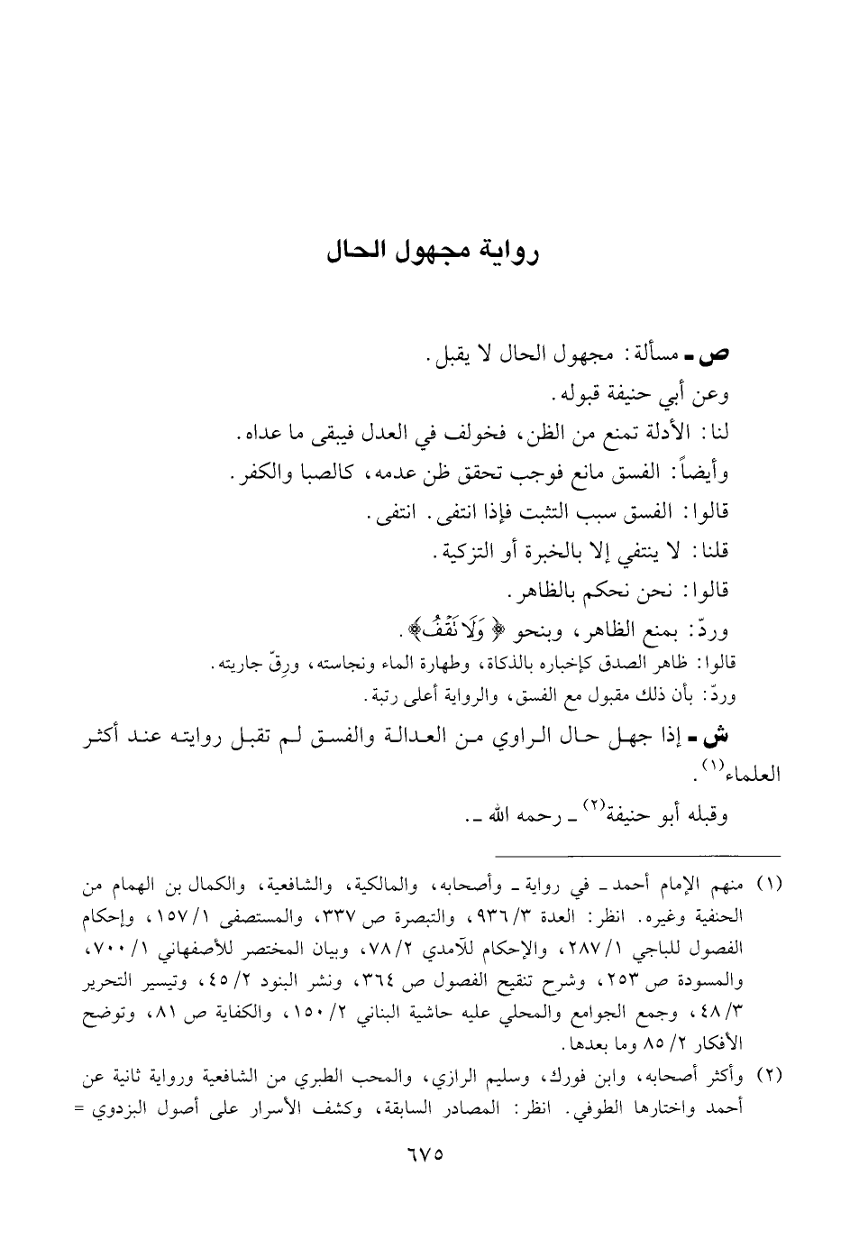 ش ــ إذا جهل حال الراوي من العدالة والفسق لم تقبل روايته عند أكثر العلماء.