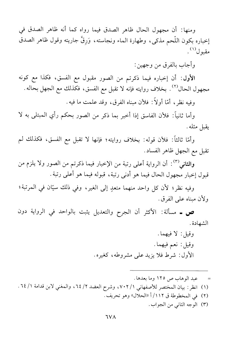 والثاني: أن الرواية أعلى رتبة من الإخبار فيما ذكرتم من الصور ولا يلزم من قبول إخبار مجهول الحال فيما هو أدنى رتبة، قبوله فيما هو أعلى رتبة.