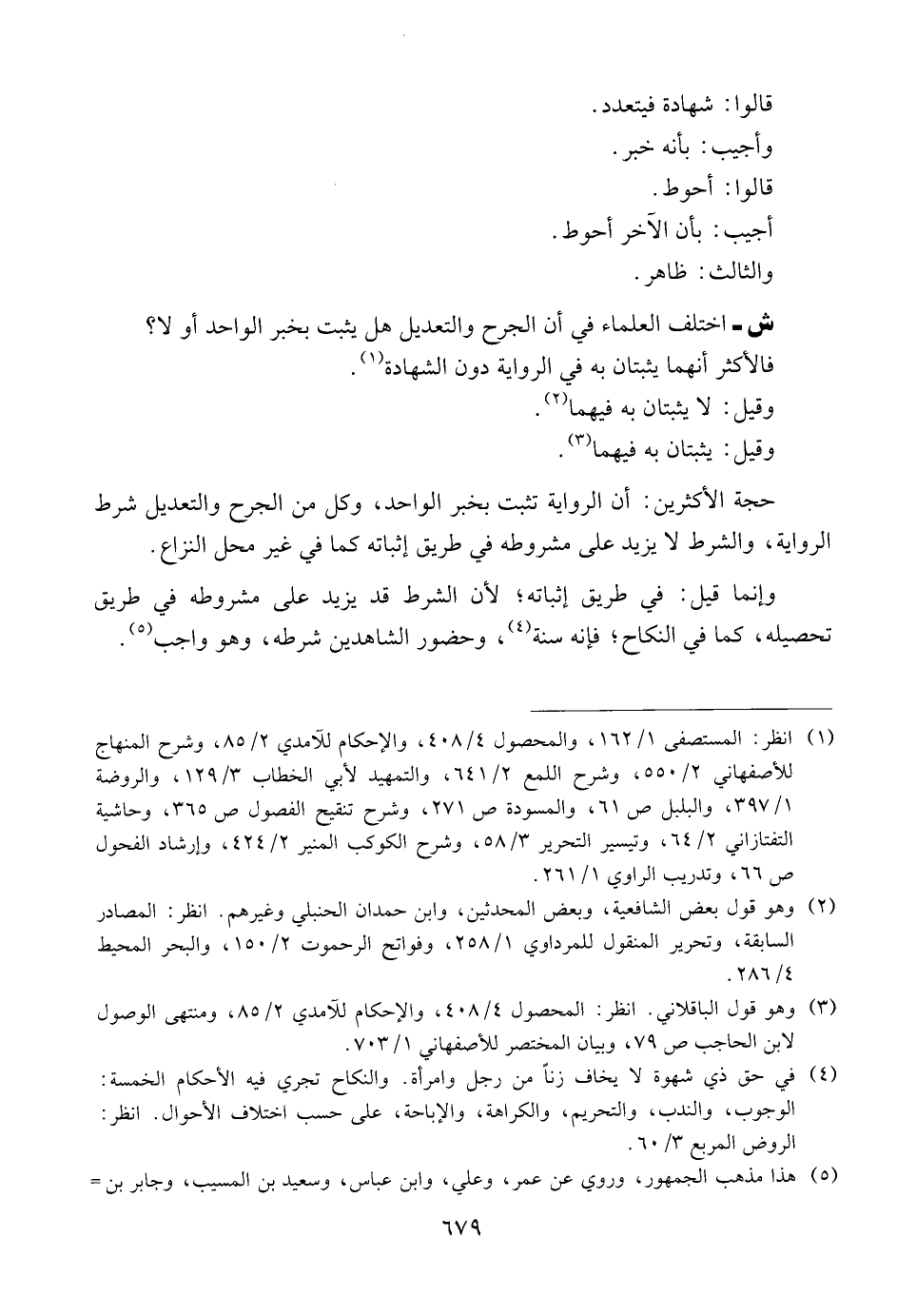 ش ــ اختلف العلماء في أن الجرح والتعديل هل يثبت بخبر الواحد أو لا؟
