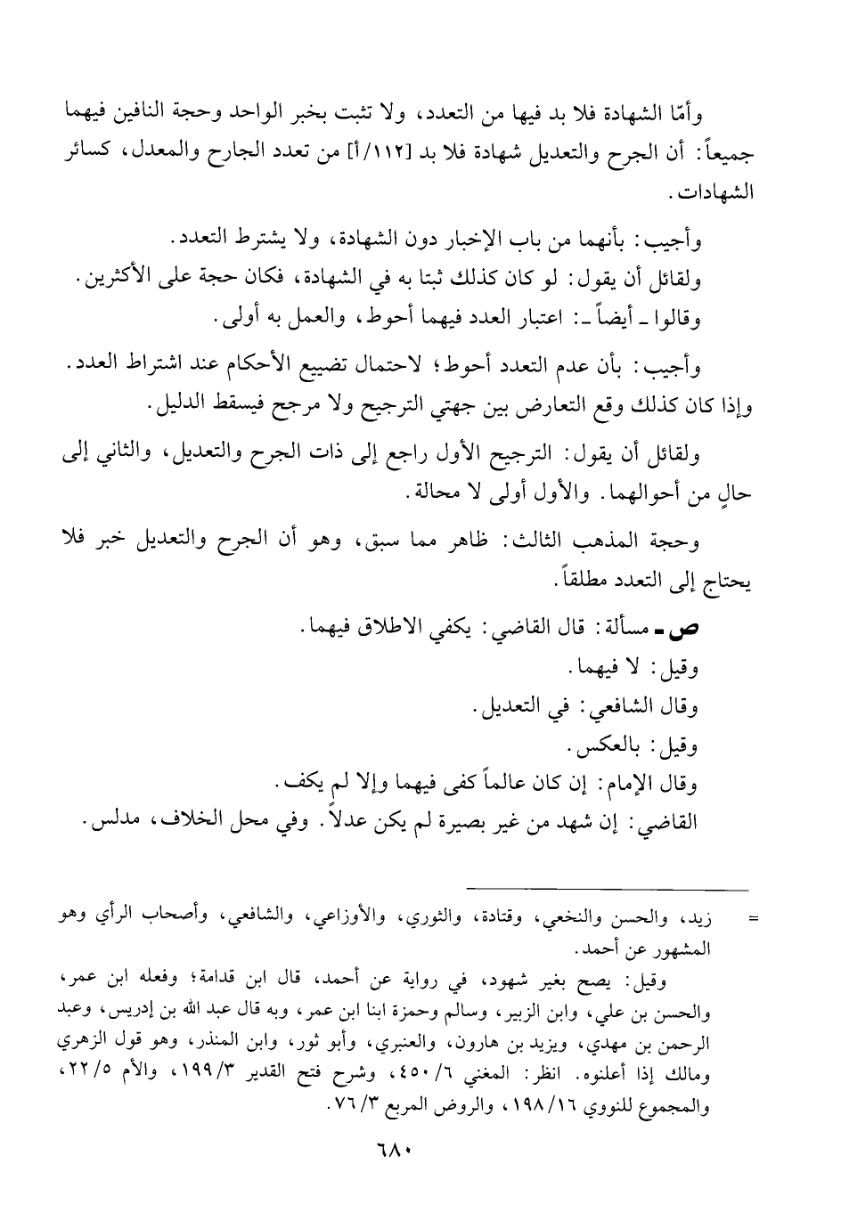 وأمّا الشهادة فلا بد فيها من التعدد، ولا تثبت بخبر الواحد وحجة النافين فيهما جميعاً: أن الجرح والتعديل شهادة فلا بد [١١٢/أ] من تعدد الجارح والمعدل، كسائر الشهادات.
