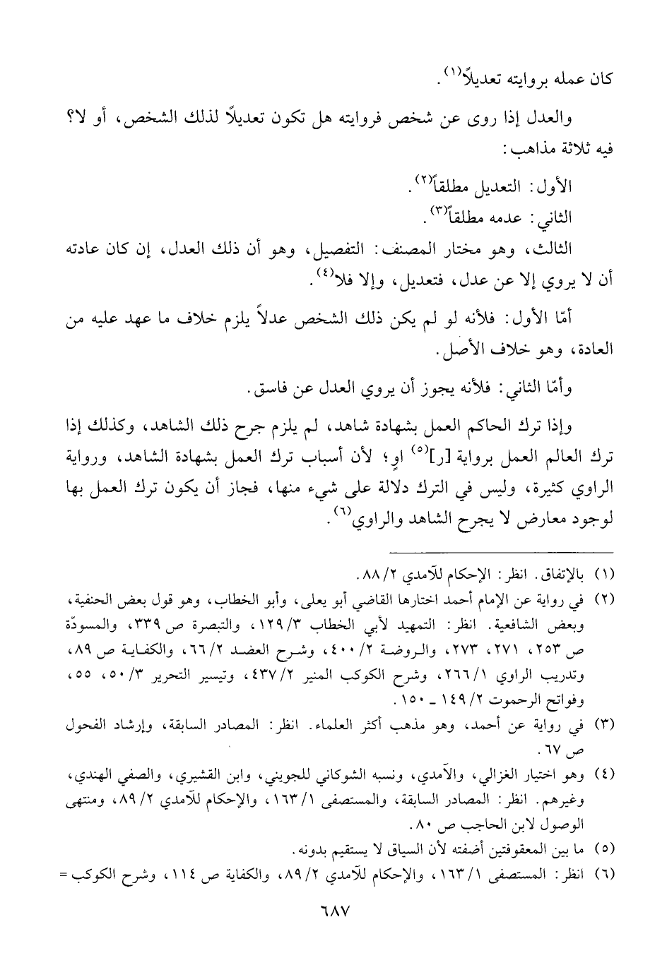 وإذا ترك الحاكم العمل بشهادة شاهد، لم يلزم جرح ذلك الشاهد، وكذلك إذا ترك العالم العمل برواية [ر] اوٍ؛ لأن أسباب ترك العمل بشهادة الشاهد، ورواية الراوي كثيرة، وليس في الترك دلالة على شيء منها، فجاز أن يكون ترك العمل بها لوجود معارض لا يجرح الشاهد والراوي.
