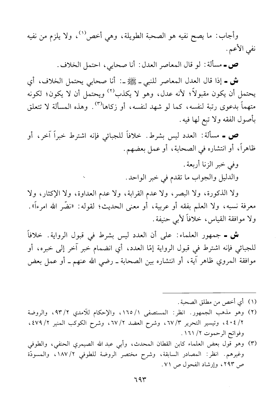 ش ــ إذا قال العدل المعاصر للنبي ــ صلى الله عليه وسلم ــ: أنا صحابي يحتمل الخلاف، أي يحتمل أن يكون مقبولاً؛ لأنه عدل، وهو لا يكذب ويحتمل أن لا يكون؛ لكونه متهماً بدعوى رتبة لنفسه، كما لو شهد لنفسه، أو زكاها. وهذه المسألة لا تتعلق بأصول الفقه ولا تبع لها فيه.