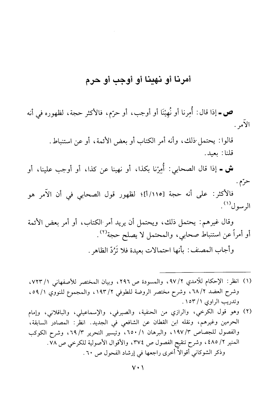 ش ــ إذا قال الصحابي: أُمِرْنا بكذا، أو نهينا عن كذا، أو أوجب علينا، أو حرّم.
