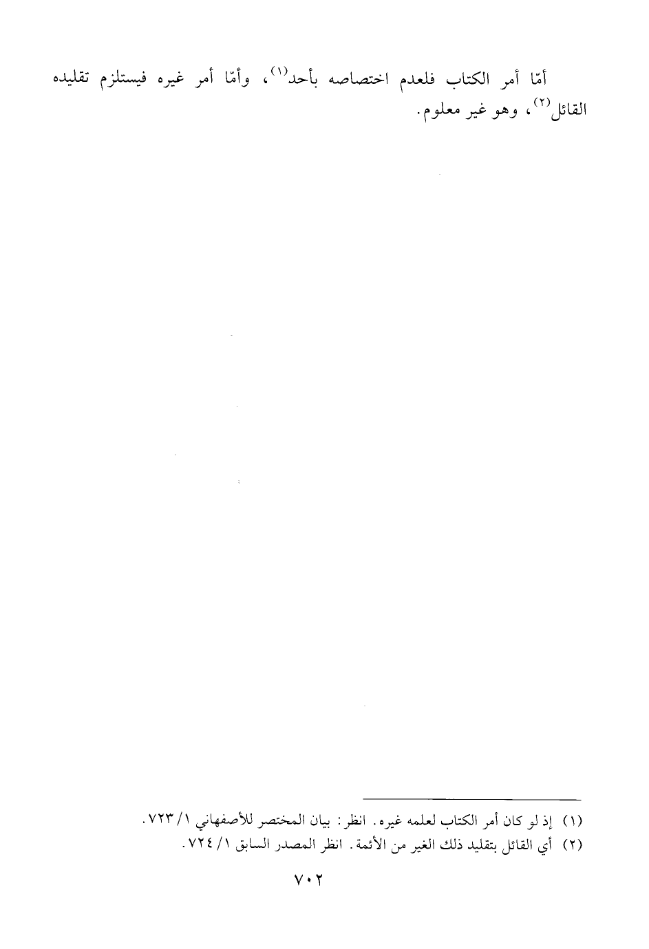 أمّا أمر الكتاب فلعدم اختصاصه بأحد، وأمّا أمر غيره فيستلزم تقليده القائل، وهو غير معلوم.