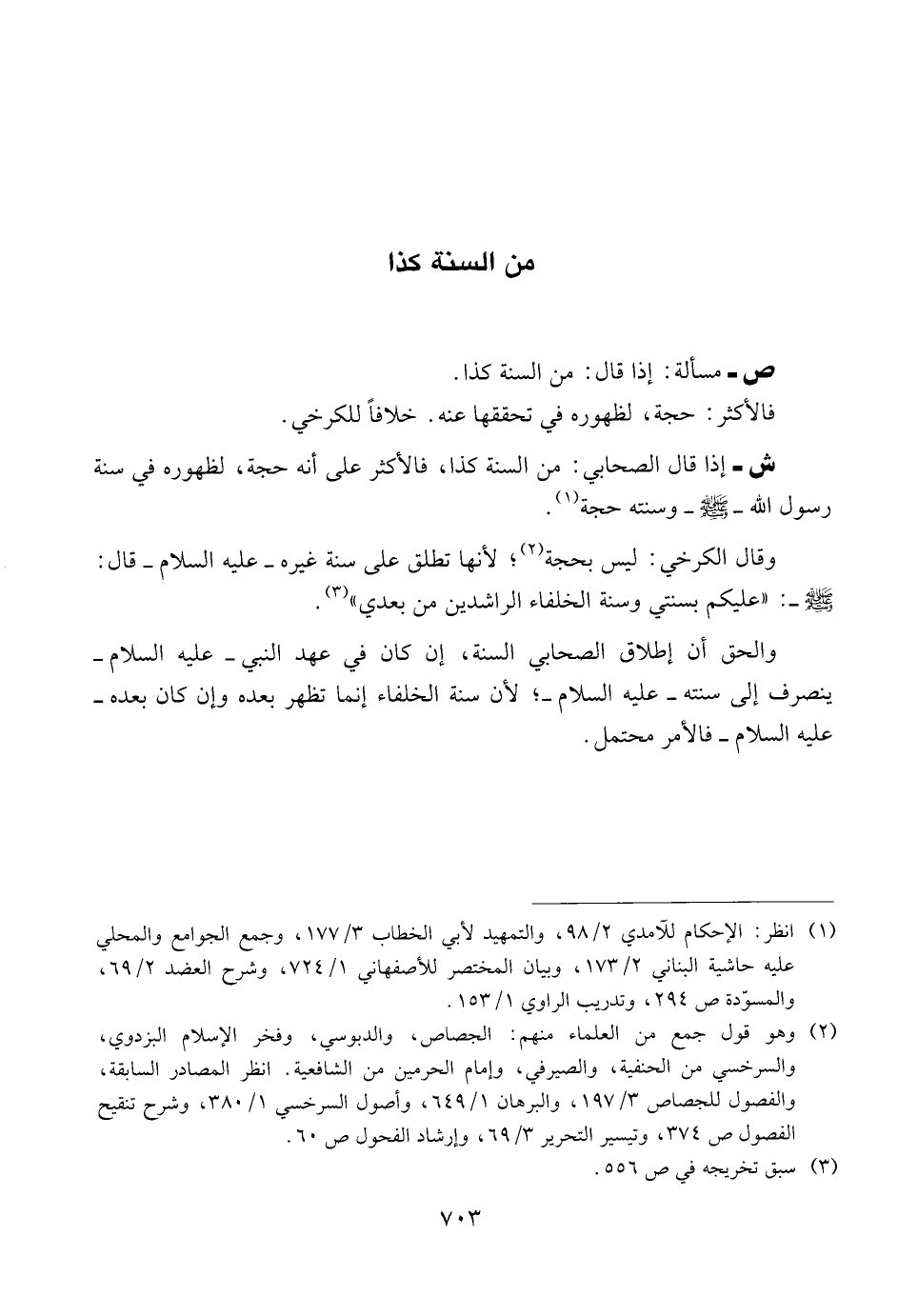 والحق أن إطلاق الصحابي السنة، إن كان في عهد النبي ــ عليه السلام ــ ينصرف إلى سنته ــ عليه السلام ــ؛ لأن سنة الخلفاء إنما تظهر بعده وإن كان بعده ــ عليه السلام ــ فالأمر محتمل.