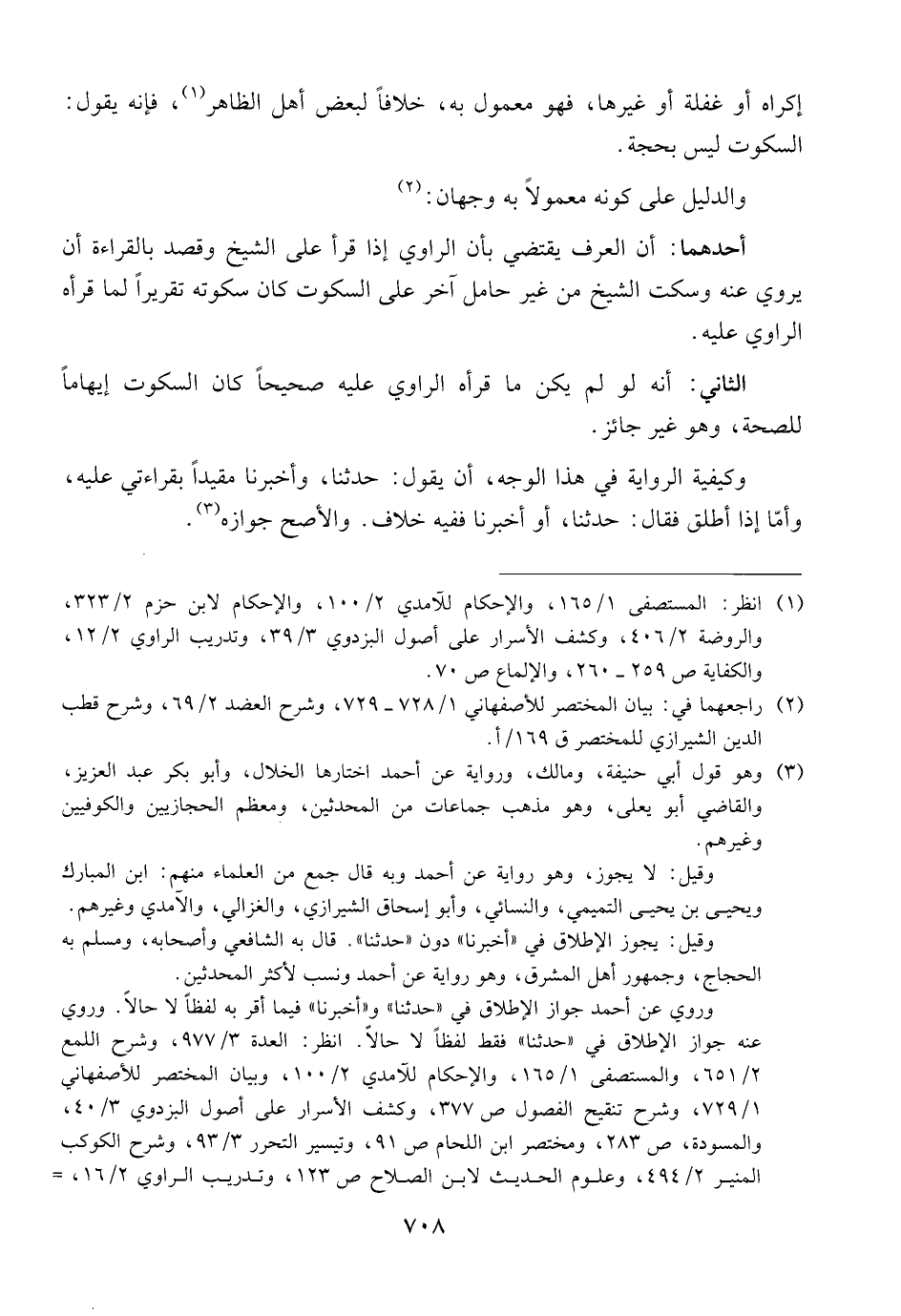 الثاني: أنه لو لم يكن ما قرأه الراوي عليه صحيحاً كان السكوت إيهاماً للصحة، وهو غير جائز.