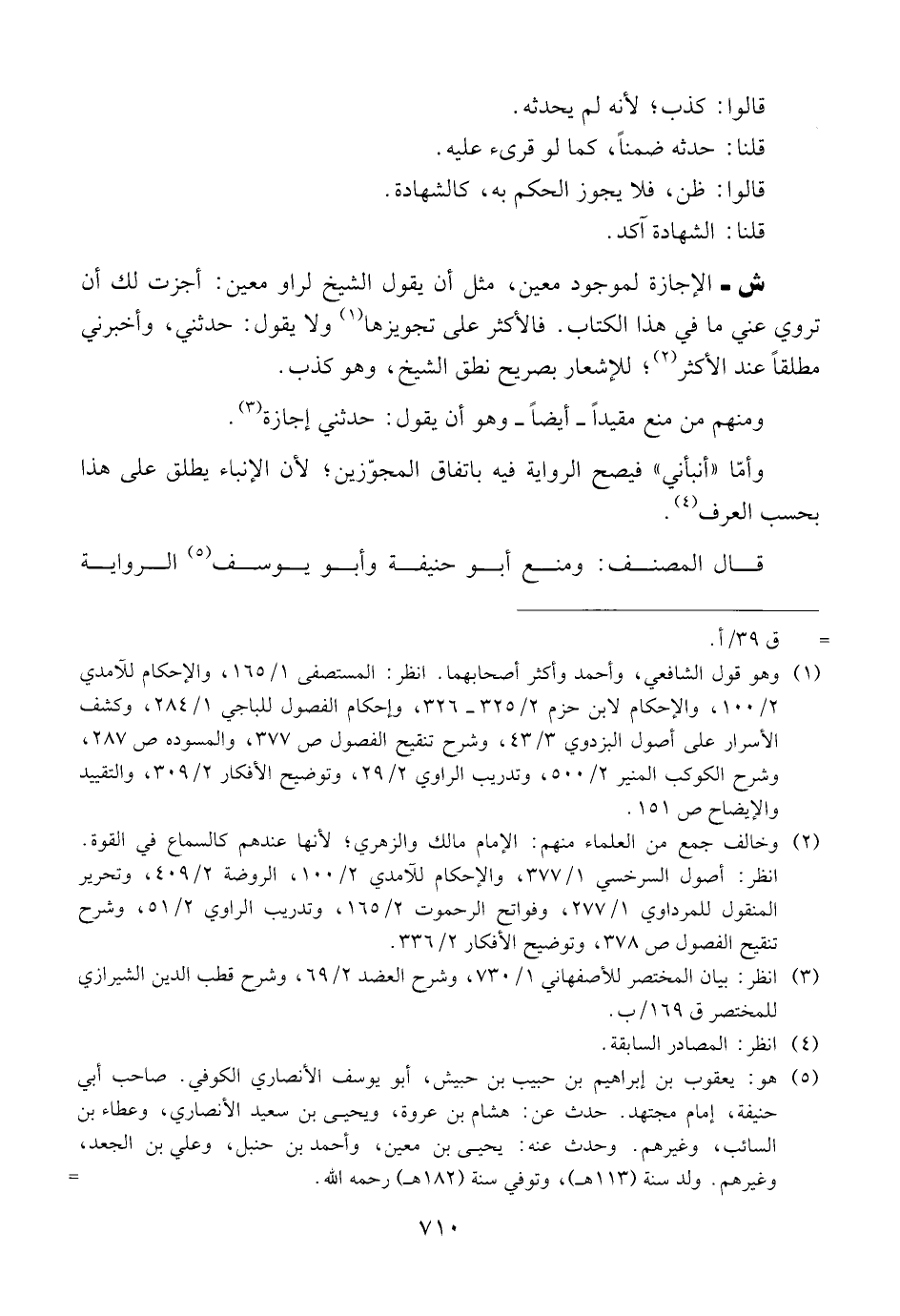 ش ــ الإجازة لموجود معين، مثل أن يقول الشيخ لراو معين: أجزت لك أن تروي عني ما في هذا الكتاب. فالأكثر على تجويزها ولا يقول: حدثني، وأخبرني مطلقاً عند الأكثر؛ للإشعار بصريح نطق الشيخ، وهو كذب.