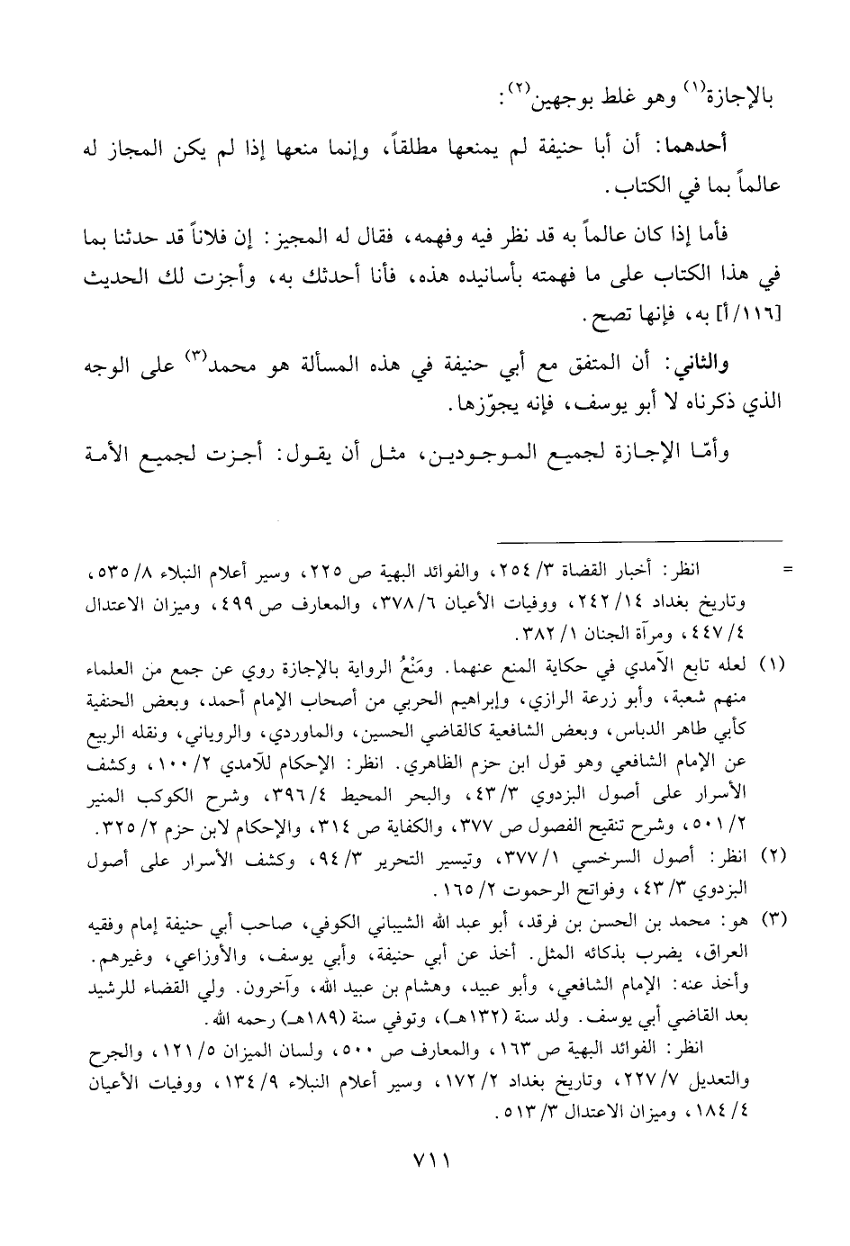 فأما إذا كان عالماً به قد نظر فيه وفهمه، فقال له المجيز: إن فلاناً قد حدثنا بما في هذا الكتاب على ما فهمه بأسانيده هذه، فأنا أحدثك به، وأجزت لك الحديث [١١٦/أ] به، فإنها تصح.