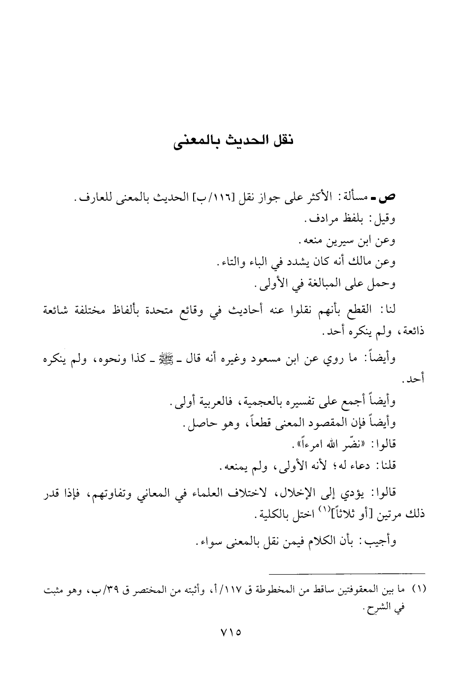 ص ــ مسألة: الأكثر على جواز نقل [١١٦/ب] الحديث بالمعنى للعارف.