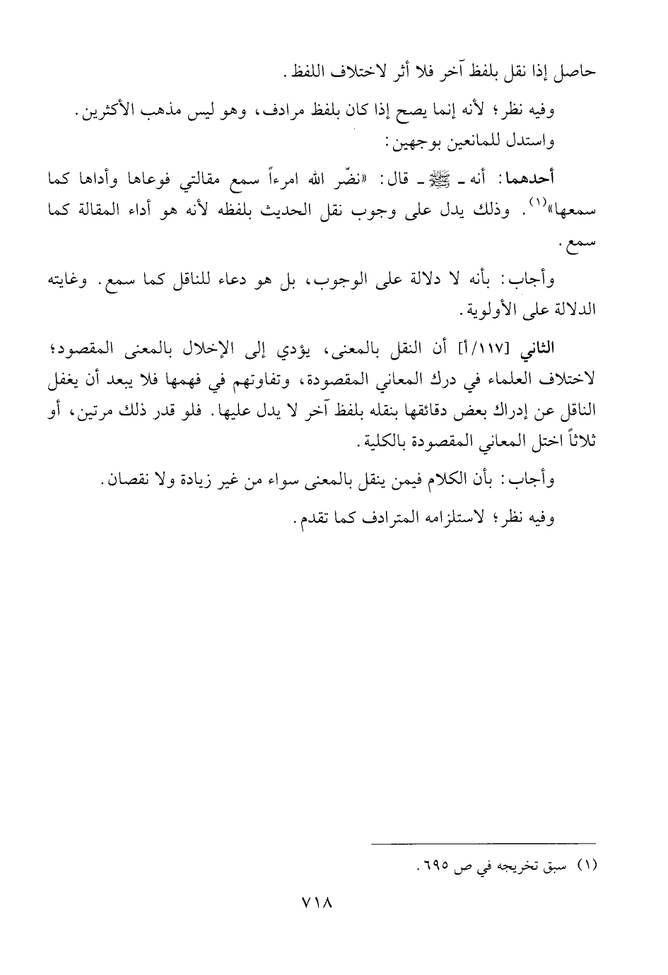 أحدهما: أنه ــ صلى الله عليه وسلم ــ قال: {{نضّر الله امرءاً سمع مقالتي فوعاها وأداها كما سمعها}}. وذلك يدل على وجوب نقل الحديث بلفظه لأنه هو أداء المقالة كما سمع.