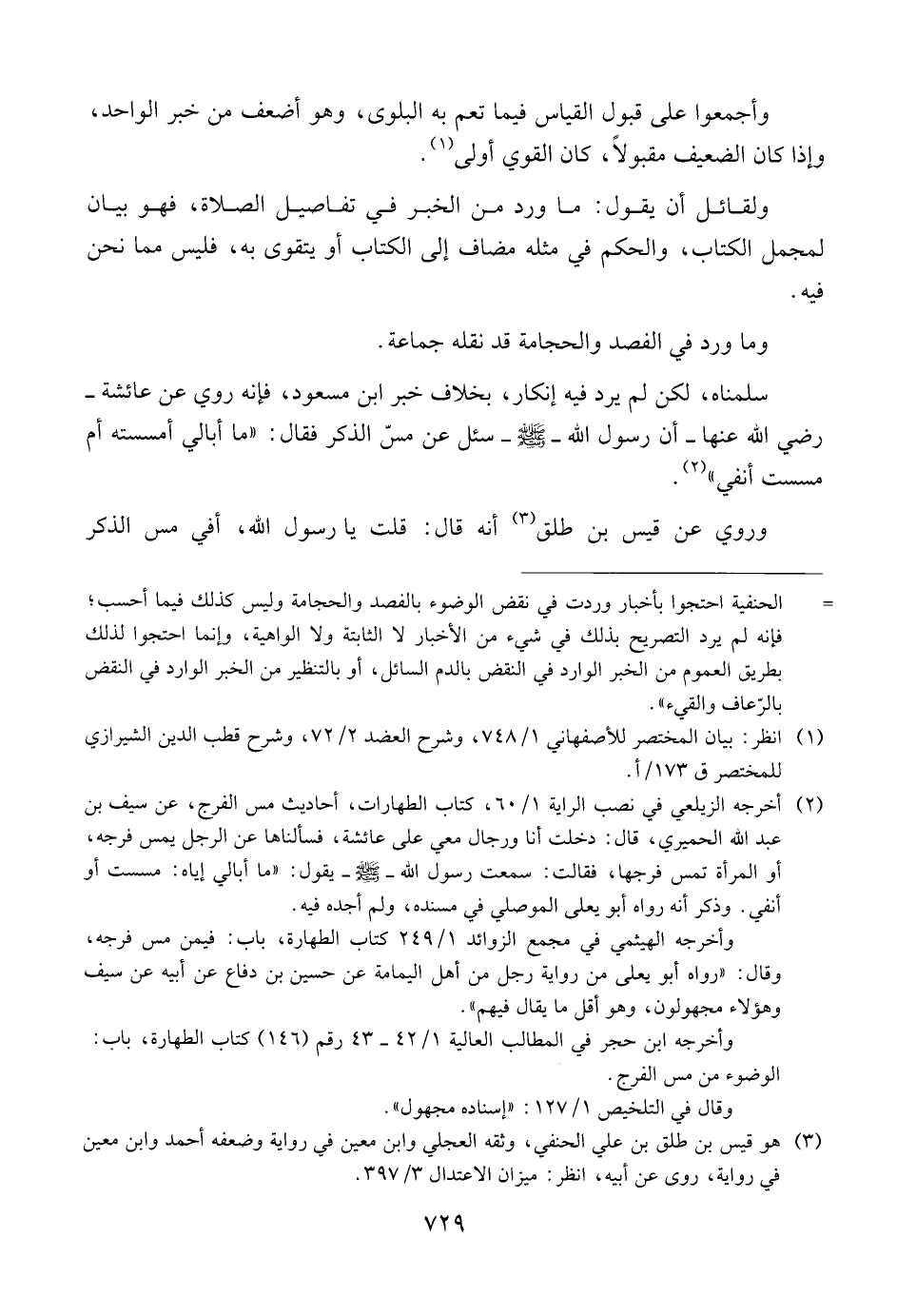 سلمناه، لكن لم يرد فيه إنكار، بخلاف خبر ابن مسعود، فإنه روى عن عائشة ــ رضي الله عنها ــ أن رسول الله ــ صلى الله عليه وسلم ــ سئل عن مسّ الذكر فقال: {{ما أبالي أمسسته أم مسست أنفي}}.