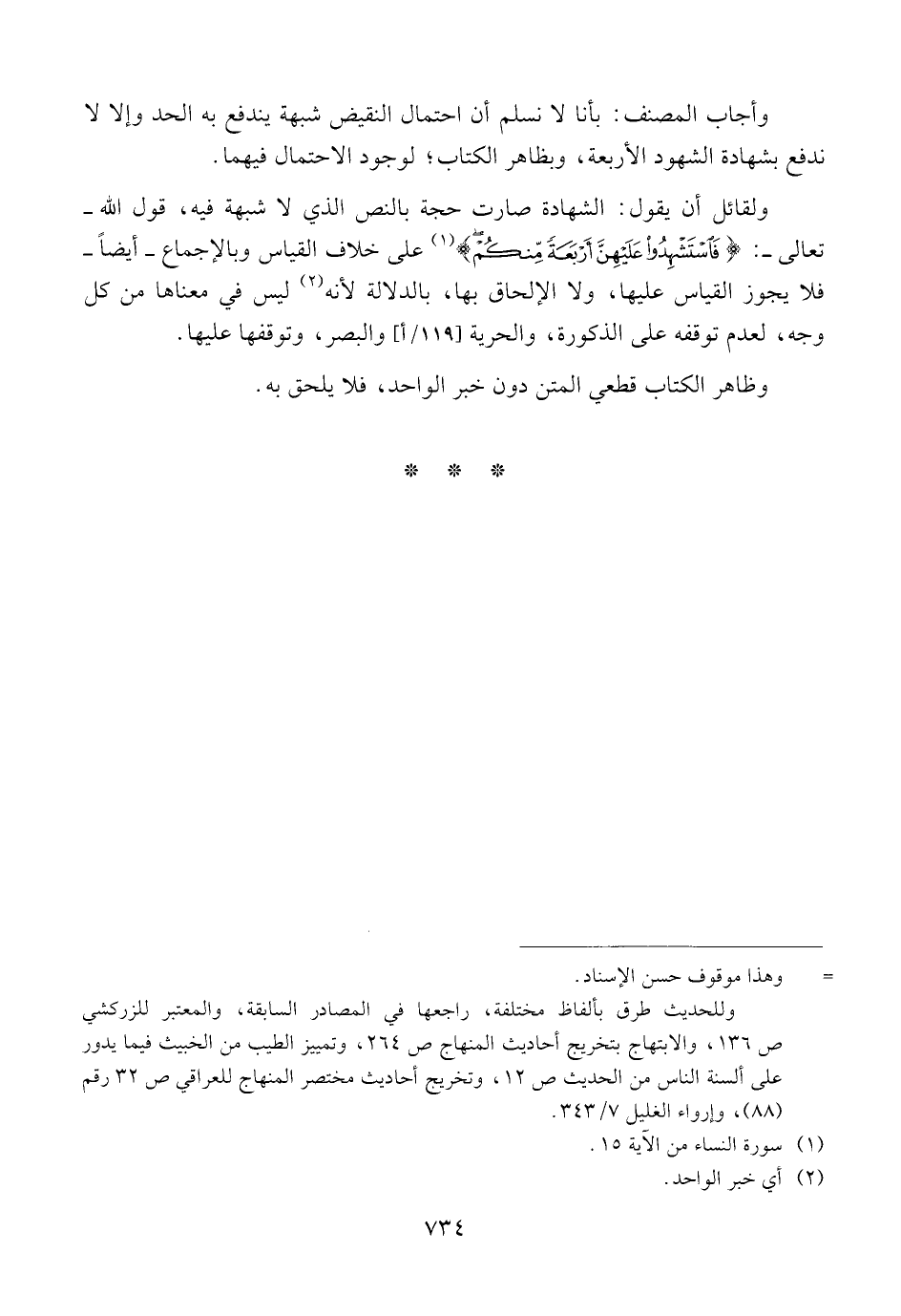 وأجاب المصنف: بأنا لا نسلم أن احتمال النقيض شبهة يندفع به الحد وإلا لا ندفع بشهادة الشهود الأربعة، وبظاهر الكتاب؛ لوجود الاحتمال فيهما.