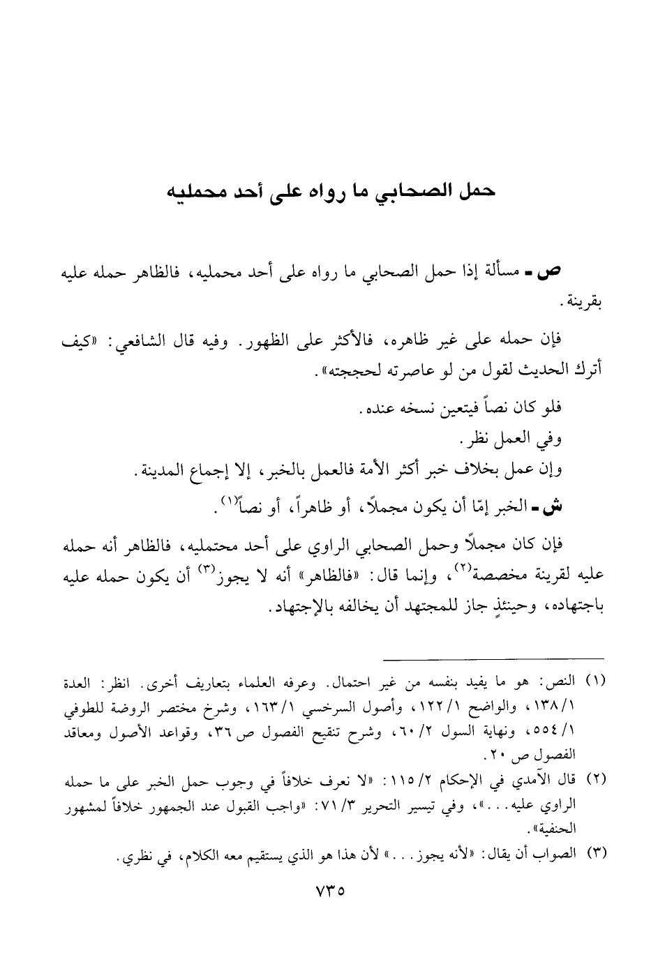 ص ــ مسألة: إذا حمل الصحابي ما رواه على أحد محمليه، فالظاهر حمله عليه بقرينة.