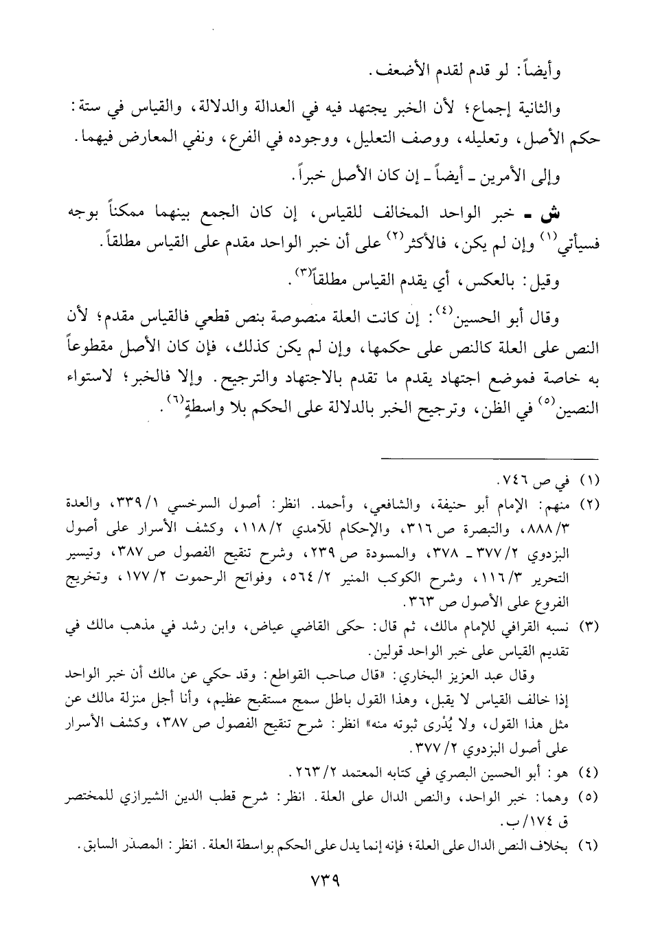وقال أبو الحسين: إن كانت العلة منصوصة بنص قطعي فالقياس مقدم؛ لأن النص على العلة كالنص على حكمها، وإن لم يكن كذلك، فإن كان الأصل مقطوعاً به خاصة فموضع اجتهاد يقدم ما تقدم بالاجتهاد والترجيح. وإلا فالخبر؛ لاستواء النصين في الظن، وترجيح الخبر بالدلالة على الحكم بلا واسطةٍ.