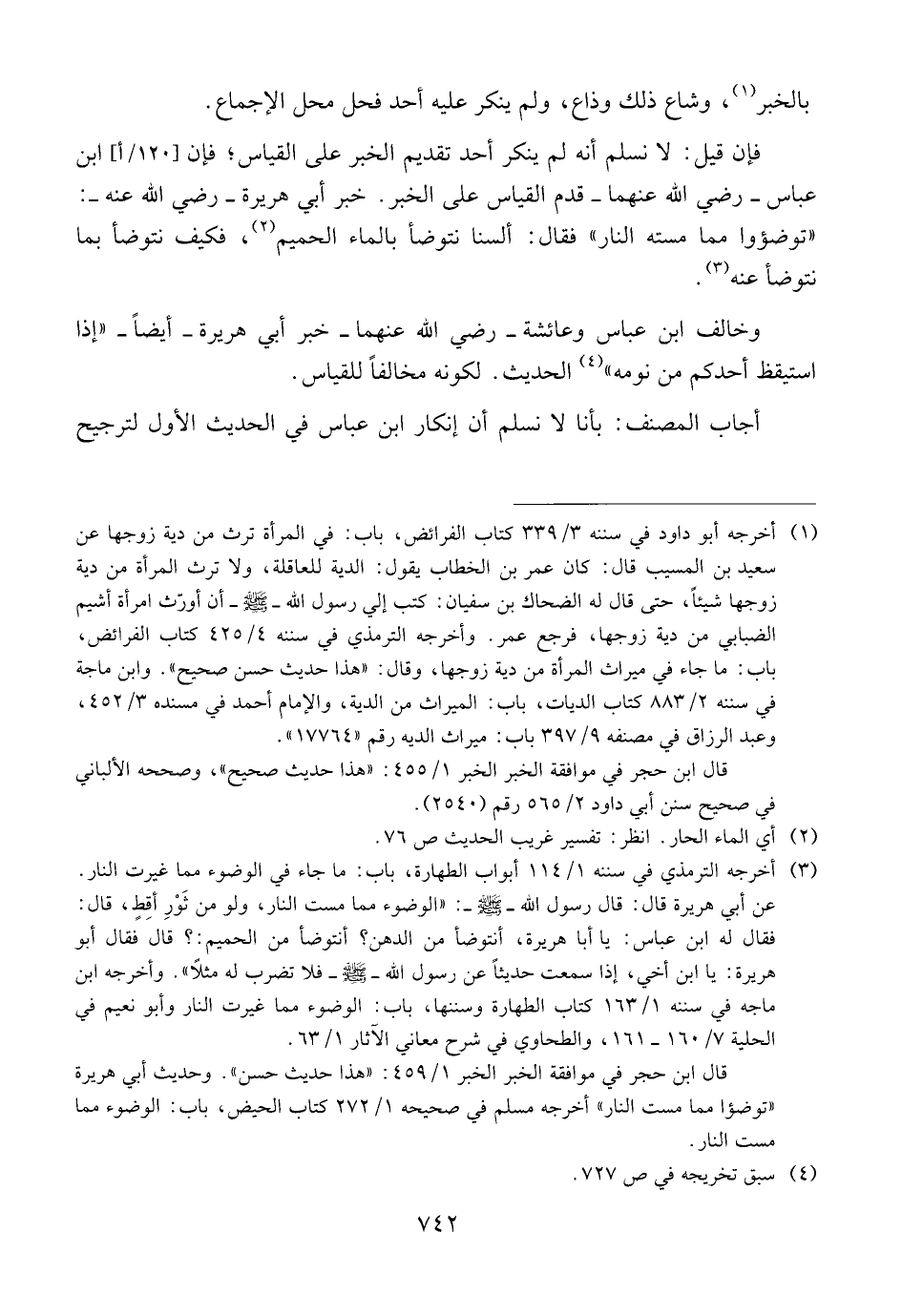 فإن قيل: لا نسلم أنه لم ينكر أحد تقديم الخبر على القياس؛ فإن [١٢٠/أ] ابن عباس ــ رضي الله عنهما ــ قدم القياس على الخبر. خبر أبي هريرة ــ رضي الله عنه ــ: {{توضؤوا مما مسته النار}} فقال: ألسنا نتوضأ بالماء الحميم، فكيف نتوضأ بما نتوضأ عنه.
