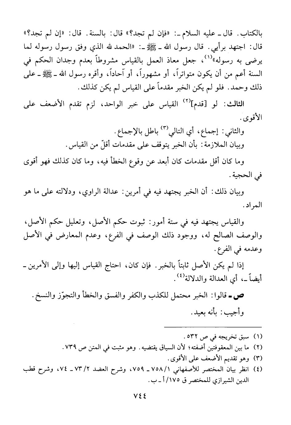 بالكتاب. قال ــ عليه السلام ــ: {{فإن لم تجد؟}} قال: بالسنة. قال: {{إن لم تجد؟}} قال: اجتهد برأيي. قال رسول الله ــ صلى الله عليه وسلم ــ: {{الحمد لله الذي وفق رسول رسوله لما يرضى به رسوله}}، جعل معاذ العمل بالقياس مشروطاً بعدم وجدان الحكم في السنة أعم من أن يكون متواتراً، أو مشهوراً، أو آحاداً، وأقره رسول الله ــ صلى الله عليه وسلم ــ على ذلك وحمد. فلو لم يكن الخبر مقدماً على القياس لم يكن كذلك.