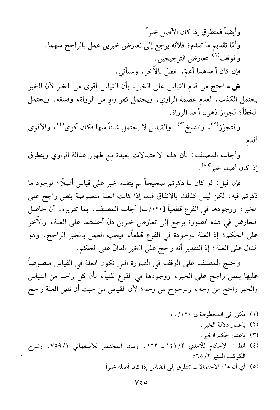 فإن قيل: لو كان ما ذكرتم صحيحاً لم يتقدم خبر على قياس أصلاً؛ لوجود ما ذكرتم فيه، لكن ليس كذلك بالاتفاق فيما إذا كانت العلة منصوصة بنص راجح على الخبر، ووجودها في الفرع قطعياً [١٢٠/ب] أجاب المصنف، بما تقريره: أن حاصل التعارض في هذه الصورة يرجع إلى تعارض خبرين دلّ أحدهما على العلة، والآخر على الحكم؛ إذ العلة موجودة في الفرع قطعاً، فيجب العمل بالخبر الراجح، وهو الدال على العلة؛ إذ التقدير أنه راجح على الخبر الدالّ على الحكم.