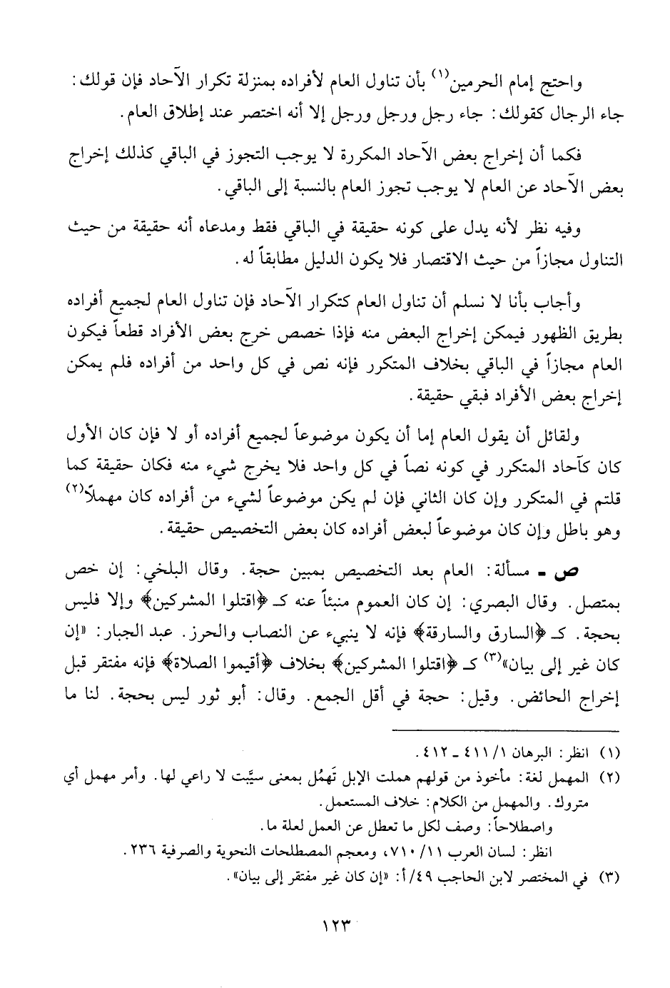ص - مسألة: العام بعد التخصيص بمبين حجة. وقال البلخي: إن خص بمتصل. وقال البصري: إن كان العموم منبئا عنه ك (اقتلوا المشركين) وإلا فليس بحجة. ك (السارق والسارقة) فإنه لا ينبئ عن النصاب والحرز. عبد الجبار: " إن كان غير إلى بيان " ك (اقتلوا المشركين) بخلاف (أقيموا الصلاة) فإنه مفتقر قبل إخراج الحائض. وقيل: حجة في أقل الجمع. وقال: أبو ثور ليس بحجة. لنا ما