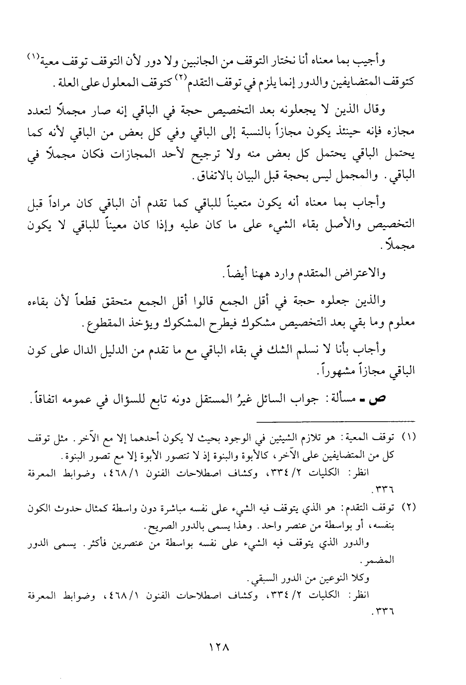وأجيب بما معناه أنا نختار التوقف من الجانبين ولا دور لأن التوقف توقف معية كتوقف المتضايفين والدور إنما يلزم في توقف التقدم كتوقف المعلول على العلة.