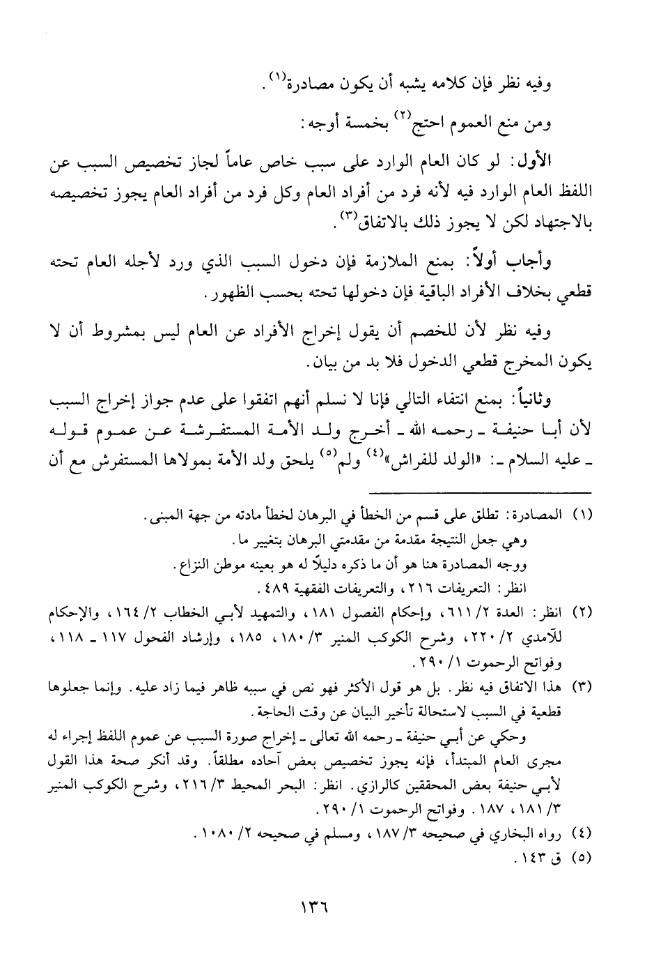 وثانيا: بمنع انتفاء التالي فإنا لا نسلم أنهم اتفقوا على عدم جواز إخراج السبب لأن أبا حنيفة - رحمه الله - أخرج ولد الأمة المستفرشة عن عموم قوله - عليه السلام -: " الولد للفراش " ولم يلحق ولد الأمة بمولاها المستفرش مع أن