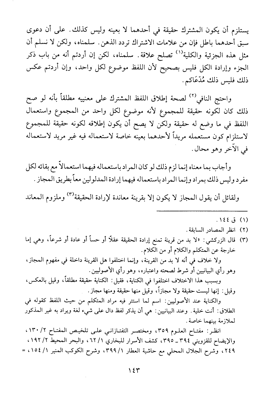 يستلزم أن يكون المشترك حقيقة في أحدهما لا بعينه وليس كذلك. على أن دعوى سبق أحدهما باطل فإن من علامات الاشتراك تردد الذهن. سلمناه , ولكن لا نسلم أن مثل هذه الجزئية والكلية تصلح علاقة. سلمناه , لكن إن أردتم أنه من باب ذكر الجزء وإرادة الكل فليس بصحيح لأن اللفظ موضوع لكل واحد , وإن أردتم عكس ذلك فليس ذلك مدعاكم.