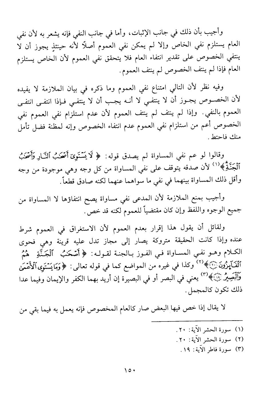 ولقائل أن يقول هذا إقرار بعدم العموم لأن الاستغراق في العموم شرط عنده وإذا كانت الحقيقة متروكة يصار إلى مجاز تدل عليه قرينة وهي فحوى الكلام وهو نفي المساواة في الفوز بالجنة لقوله: (أصحب الجنة هم الفائزون) وكذا في غيره من المواضع كما في قوله تعالى: (وما يستوى العمى والبصير) يعني في البصر أو في البصيرة إن أريد بهما الكفر والإيمان وفيما عدا ذلك تكون كالمجمل.