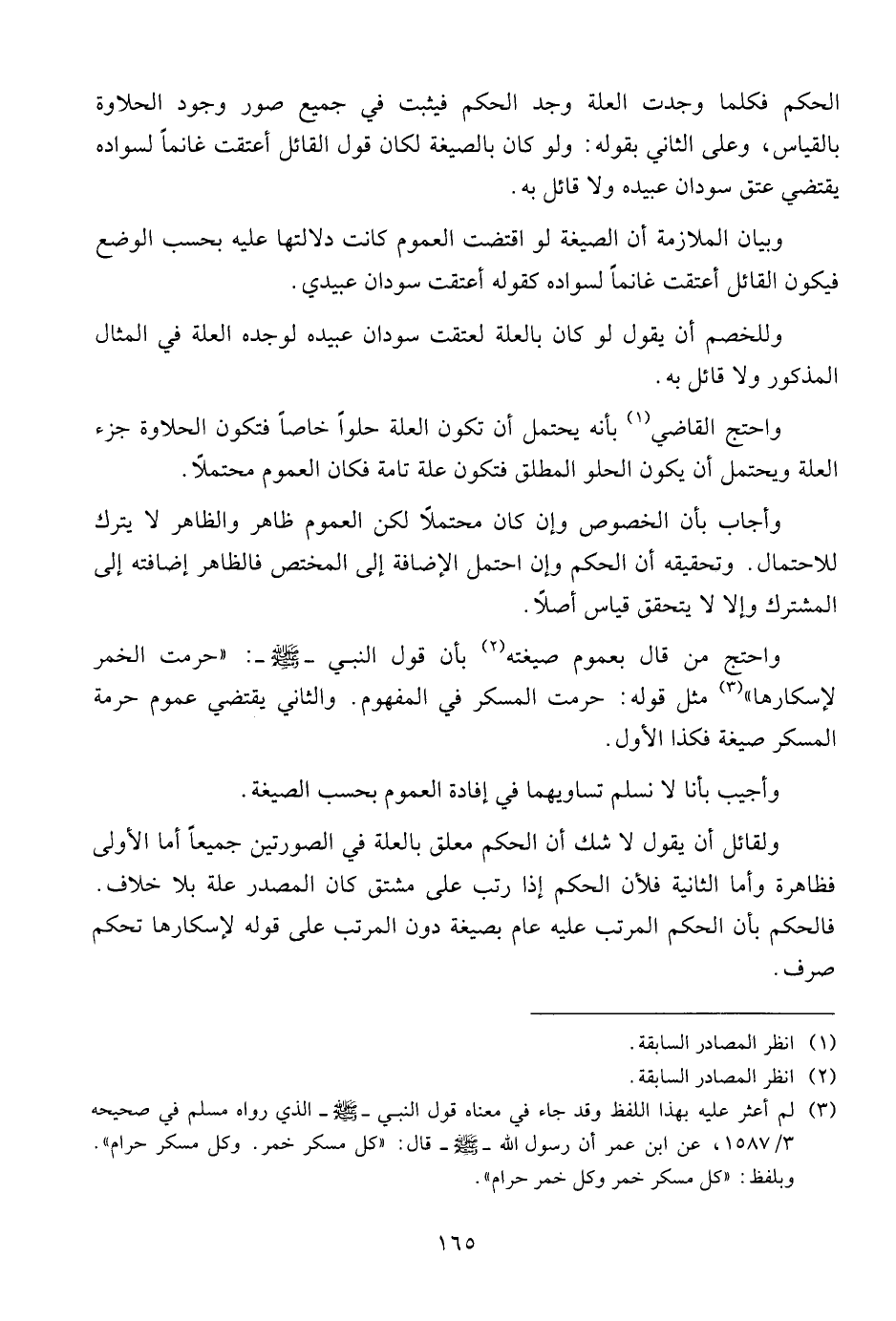 واحتج من قال بعموم صيغته بأن قول النبي - صلى الله عليه وسلم -: " حرمت الخمر لإسكارها " مثل قوله: حرمت المسكر في المفهوم. والثاني يقتضي عموم حرمة المسكر صيغة فكذا الأول.