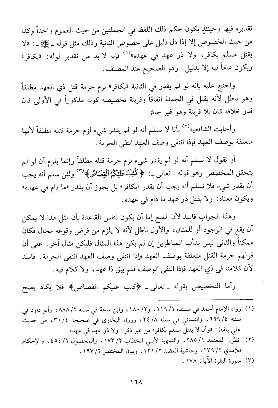 أو تقول لا نسلم أنه لو لم يقدر شيء لزم حرمة قتله مطلقا وإنما يلزم أن لو لم يتحقق المخصص وهو قوله - تعالى -: (كتب عليكم القصاص) ولئن سلم أنه يجب أن يقدر شيء فلا نسلم أنه يجب أن يقدر " بكافر " بل يجوز أن يقدر " ما دام في عهده " ويكون معناه: ولا يقتل ذو عهد ما دام في عهده.