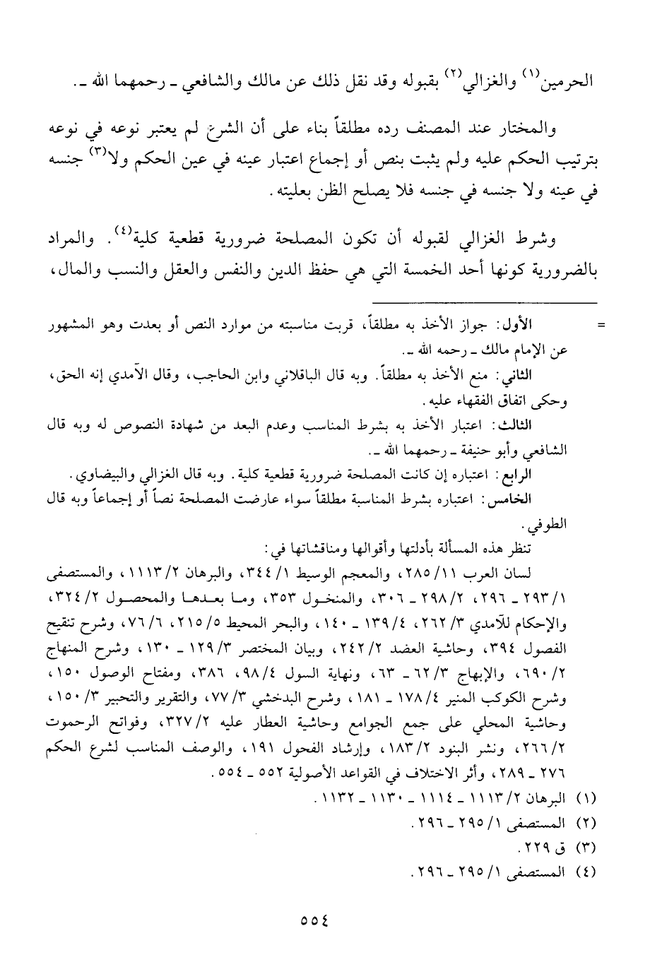 وشرط الغزالي لقبوله أن تكون المصلحة ضرورية قطعية كلية. والمراد بالضرورية كونها أحد الخمسة التي هي حفظ الدين والنفس والعقل والنسب والمال ,