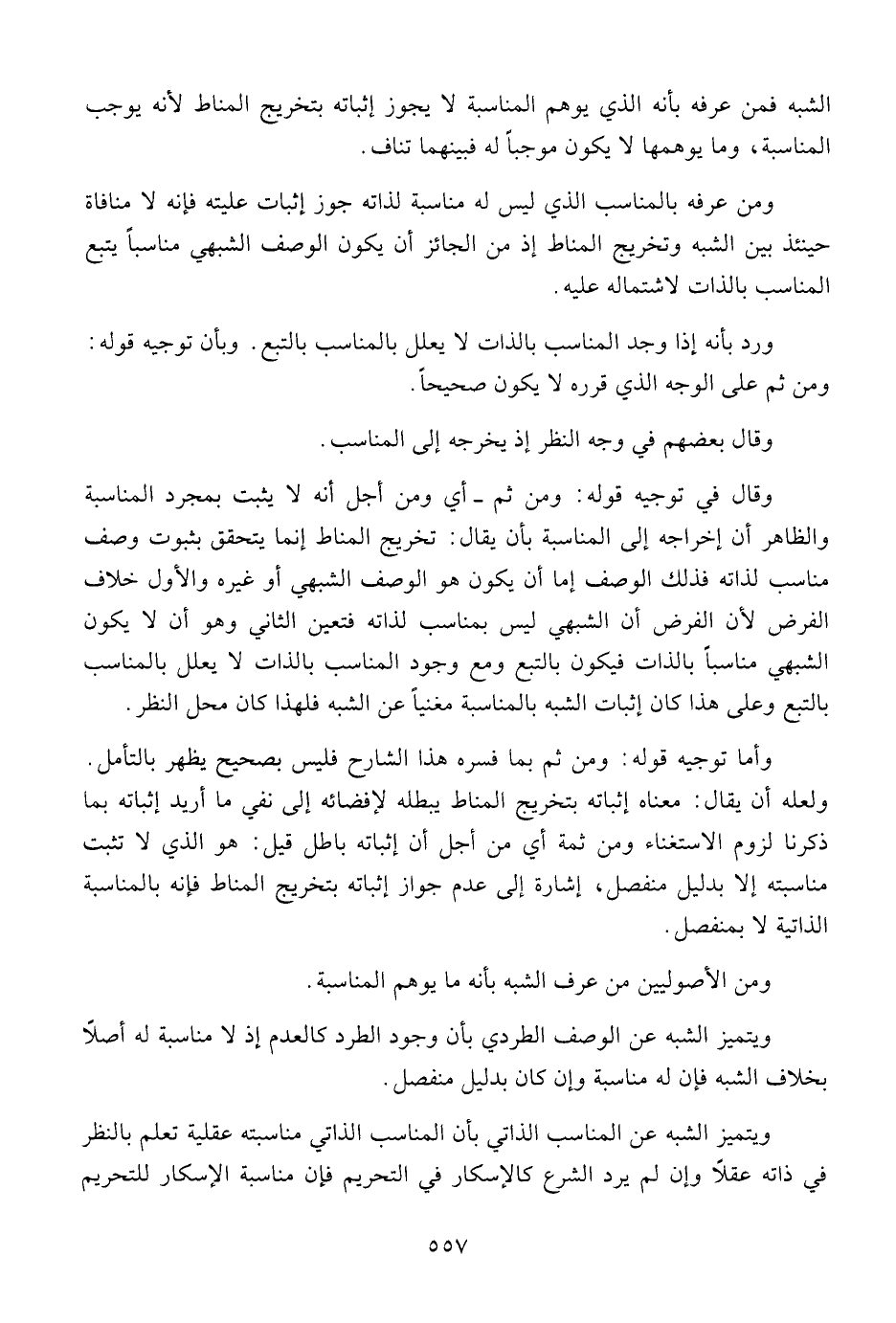 وقال في توجيه قوله: ومن ثم - أي ومن أجل أنه لا يثبت بمجرد المناسبة والظاهر أن إخراجه إلى المناسبة بأن يقال: تخريج المناط إنما يتحقق بثبوت وصف مناسب لذاته فذلك الوصف إما أن يكون هو الوصف الشبهي أو غيره والأول خلاف الفرض لأن الفرض أن الشبهي ليس بمناسب لذاته فتعين الثاني وهو أن لا يكون الشبهي مناسبا بالذات فيكون بالتبع ومع وجود المناسب بالذات لا يعلل بالمناسب بالتبع وعلى هذا كان إثبات الشبه بالمناسبة مغنيا عن الشبه فلهذا كان محل النظر.
