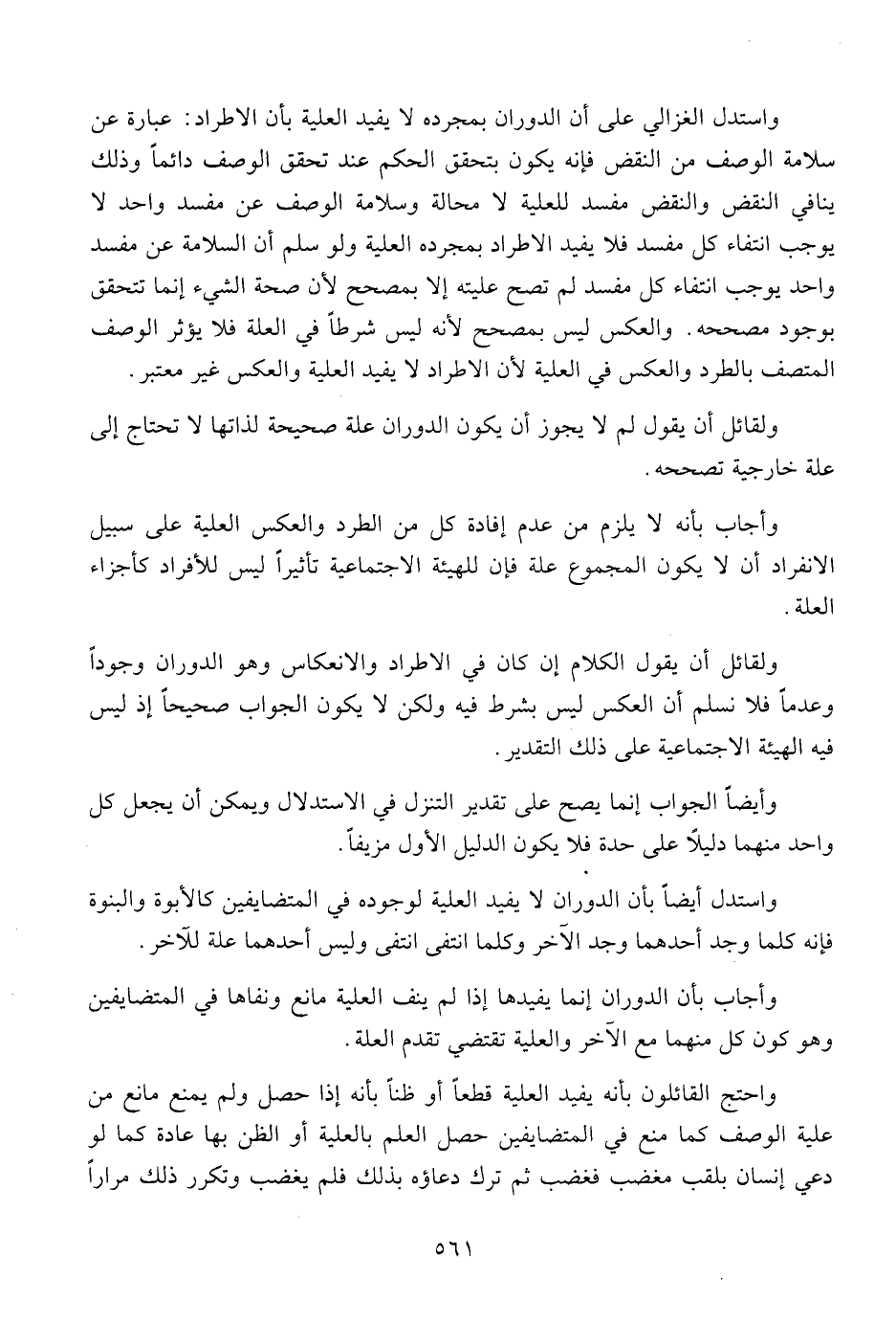 واستدل الغزالي على أن الدوران بمجرد لا يفيد العلية بأن الاطراد: عبارة عن سلامة الوصف من المقض فإنه يكون بتحقق الحكم عند تحقق الوصف دائما وذلك ينافي النقض والنقض مفسد للعلية لا محالة وسلامة الوصف عن مفسد واحد لا يوجب انتفاء كل مفسد فلا يفيد الاطراد بمجرده العلية ولو سلم أن السلامة عن مفسد واحد يوجب انتفاء كل مفسد لم تصح عليته إلا بمصحح لأن صحة الشيء إنما تتحقق بوجود مصححه. والعكس ليس بمصحح لأنه ليس شرطا في العلة فلا يؤثر الوصف المتصف بالطرد والعكس في العلية لأن الاطراد لا يفيد العلية والعكس فير معتبر.