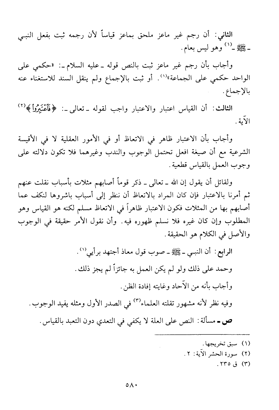 وأجاب بأن رجم غير ماعز ثبت بالنص قوله - عليه السلام -: " حكمي على الواحد حكمي على الجماعة ". أو ثبت بالإجماع ولم ينقل السند للاستغناء عنه بالإجماع.
