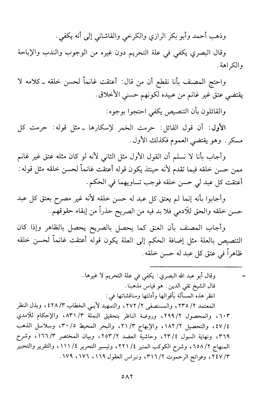 وأجاب المصنف بأن العتق كما يحصل بالصريح يحصل بالظاهر وإذا كان التنصيص بالعلة مثل إضافة الحكم إلى العلة يكون قوله أعتقت غانما لحسن خلقه ظاهرا في عتق كل عبد له حسن خلقه.
