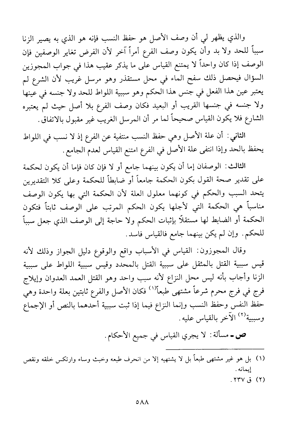 والذي يظهر لي أن وصف الأصل هو حفظ النسب فإنه هو الذي به يصير الزنا سببا للحد ولا بد وأن يكون وصف الفرع أمرا آخر لأن الفرض تغاير الوصفين فإن الوصف إذا كان واحدا لا يمتنع القياس على ما يذكر عقيب هذا في جواب المجوزين السؤال فيحصل ذلك سفح الماء في محل مستقذر وهو مرسل غريب لأن الشرع لم يعتبر عين هذا الفعل في جنس هذا الحكم وهو سببية اللواط للحد ولا جنسه في عينها ولا جنسه في جنسها القريب أو البعيد فكان وصف الفرع بلا أصل حيث لم يعتبره الشارع فلا يكون القياس صحيحا لما مر أن المرسل الغريب غير مقبول بالاتفاق.