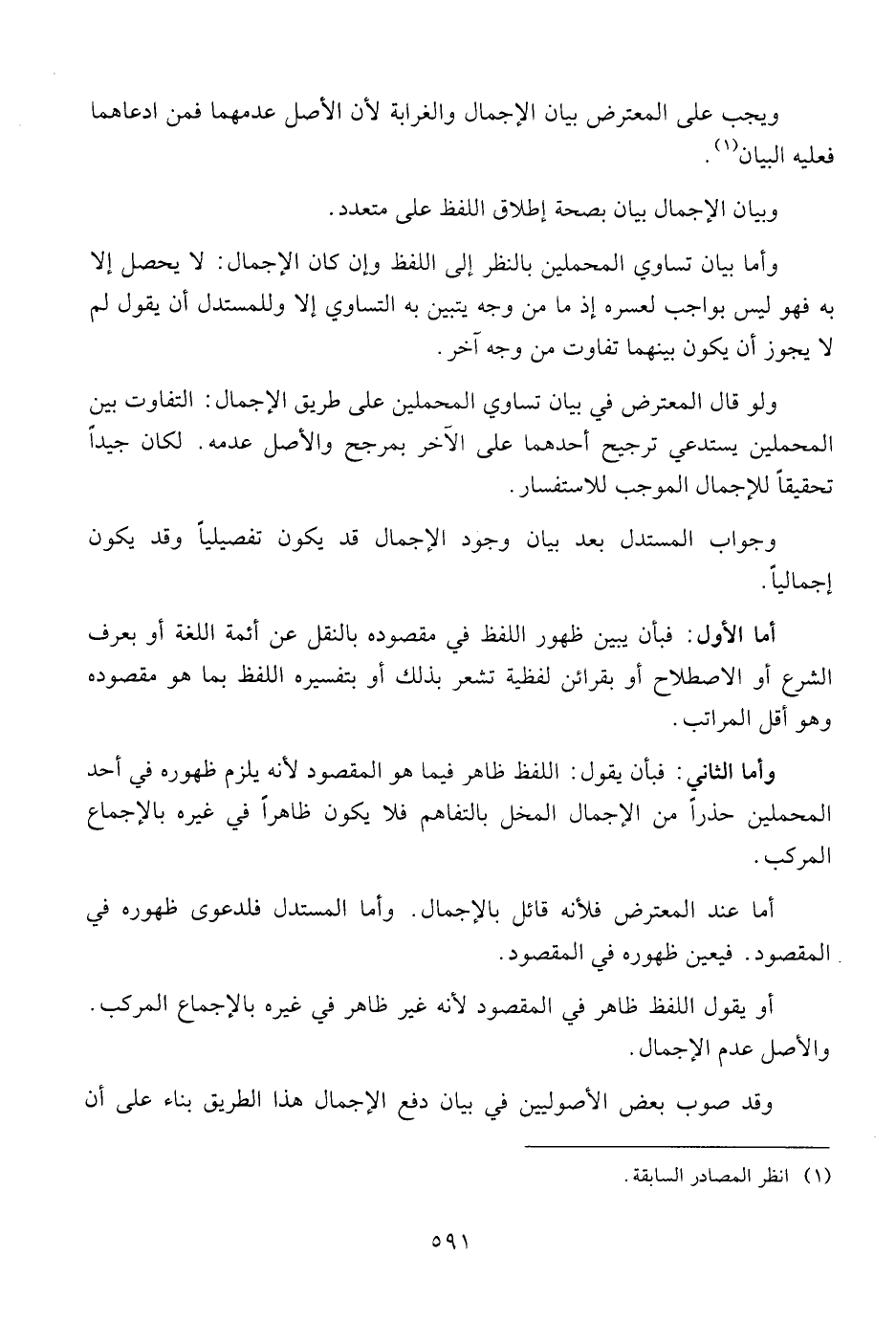وأما بيان تساوي المحملين بالنظر إلى اللفظ وإن كان الإجمال: لا يحصل إلا به فهو ليس بواجب لعسره إذ ما من وجه يتبين به التساوي إلا وللمستدل أن يقول لم لا يجوز أن يكون بينهما تفاوت من وجه آخر.