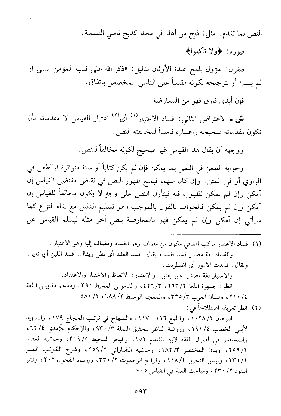 ش - الاعتراض الثاني: فساد الاعتبار أي اعتبار القياس لا مقدماته بأن تكون مقدماته صحيحة واعتباره فاسدا لمخالفته النص.