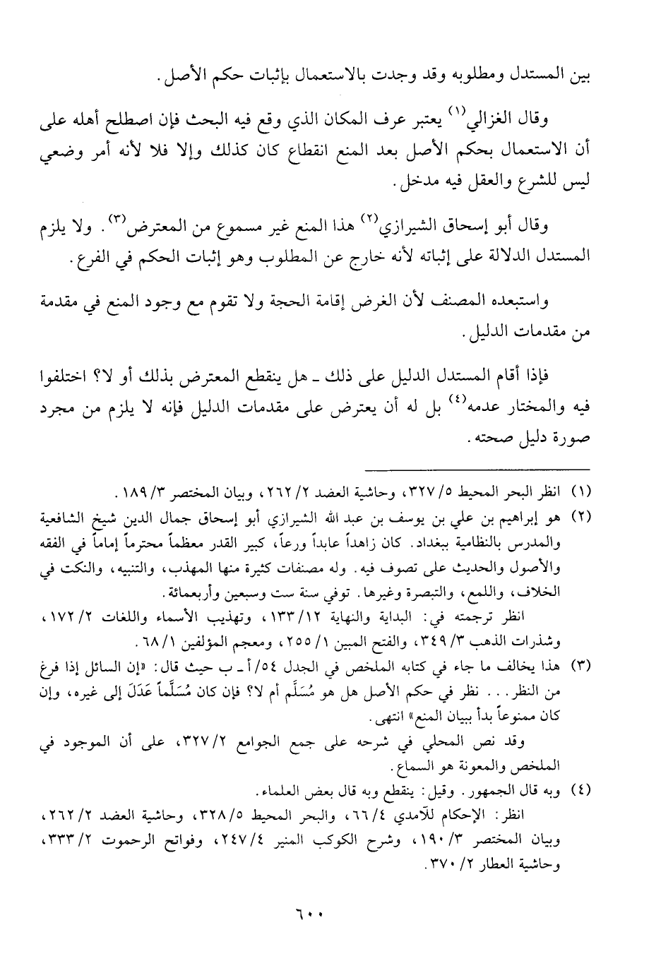 وقال أبو إسحاق الشيرازي هذا المنع غير مسموع من المعترض. ولا يلزم المستدل الدلالة على إثباته لأنه خارج عن المطلوب وهو إثبات الحكم في الفرع.