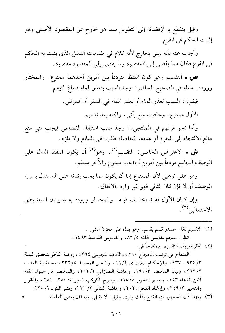 ص - التقسيم وهو كون اللفظ مترددا بين أمرين أحدهما ممنوع. والمختار وروده. مثاله في الصحيح الحاضر: وجد السبب بتعذر الماء فساغ التيمم.