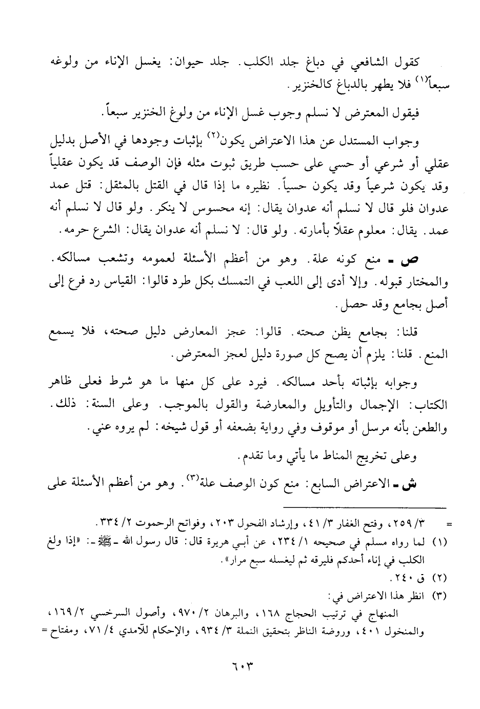 وجوابه بإثباته بأحد مسالكه. فيرد على كل منها ما هو شرط فعلى ظاهر الكتاب: الإجمال والتأويل والمعارضة والقول بالموجب. وعلى السنة: ذلك.