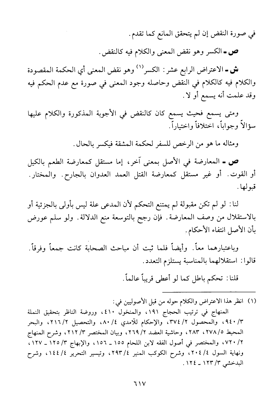 ش - الاعتراض الرابع عشر: الكسر وهو نقض المعنى أي الحكمة المقصودة والكلام فيه كالكلام في النقض وحاصله وجود المعنى في صورة مع عدم الحكم فيه وقد علمت أنه يسمع أو لا.