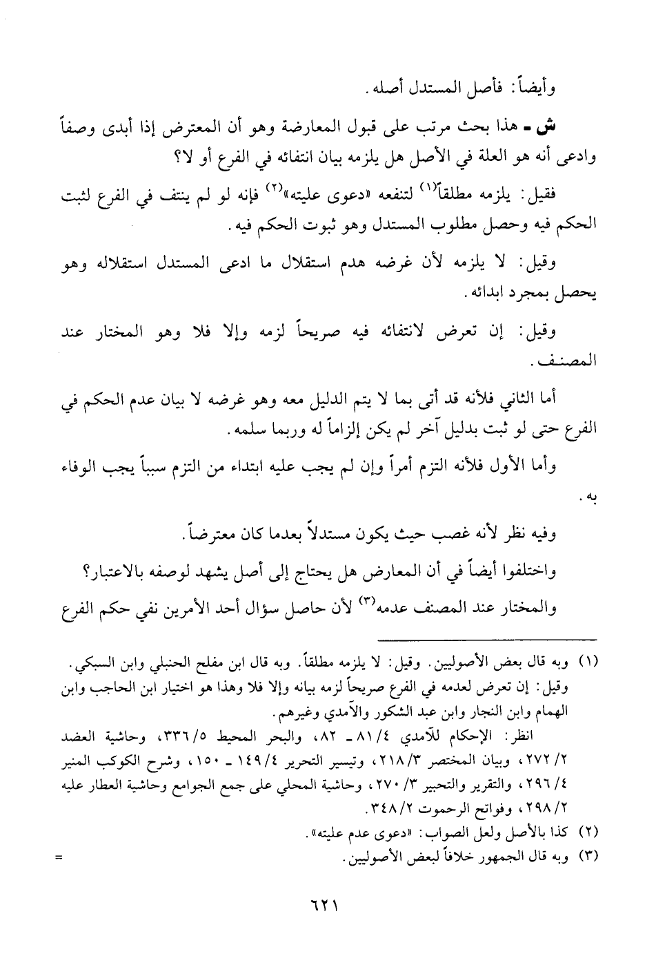 ش - هذا بحث مرتب على قبول المعارضة وهو أن المعترض إذا أبدى وصفا وادعى أنه هو العلة في الأصل هل يلزمه بيان انتفائه في الفرع أو لا؟