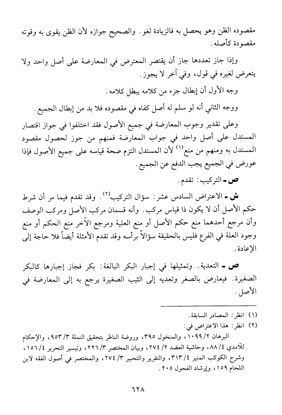 ش - الاعتراض السادس عشر: سؤال التركيب. وقد تقدم فيما مر أن شرط حكم الأصل أن لا يكون ذا قياس مركب. وأنه قسمان مركب الأصل ومركب الوصف