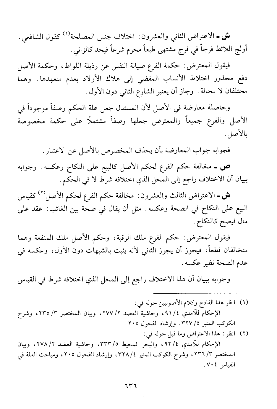 ش - الاعتراض الثالث والعشرون: مخالفة حكم الفرع لحكم الأصل كقياس البيع على النكاح في الصحة وعكسه. مثل أن يقال في صحة بين الغائب: عقد على مال فيصح كالنكاح.
