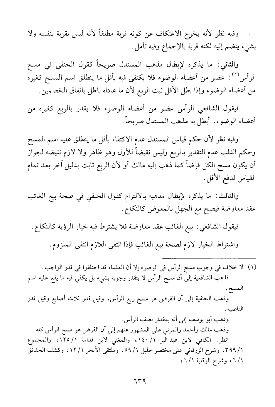 والثاني: ما يذكره لإبطال مذهب المستدل صريحا كقول الحنفي في مسح الرأس: عضو من أعضاء الوضوء فلا يكتفى فيه بأقل ما ينطلق اسم المسح كغيره من أعضاء الوضوء وإذا بطل الأقل ثبت الربع لأن ما عاداه باطل باتفاق الخصمين.